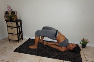 Lie on your back with knees bent and feet on the floor hip width apart. See that your arms lie beside you and your finger tips can touch the heels of your feet. As you inhale lift the buttocks up as you engage your hips and tighten your tummy.  Clasp your hands behind you and lift the shoulders to tuck them underneath the shoulder blades. This creates more space at the shoulders and allows for an increased range of motion at the hips.  Now you know why this would be my favorite pose. It also feels so good so enjoy it!